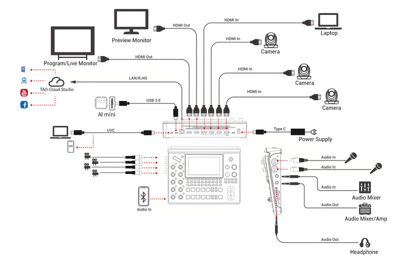 mini-edge SDIは、以下の入出力に対応した高機能なスイッチャー/ストリーミングデバイスです: