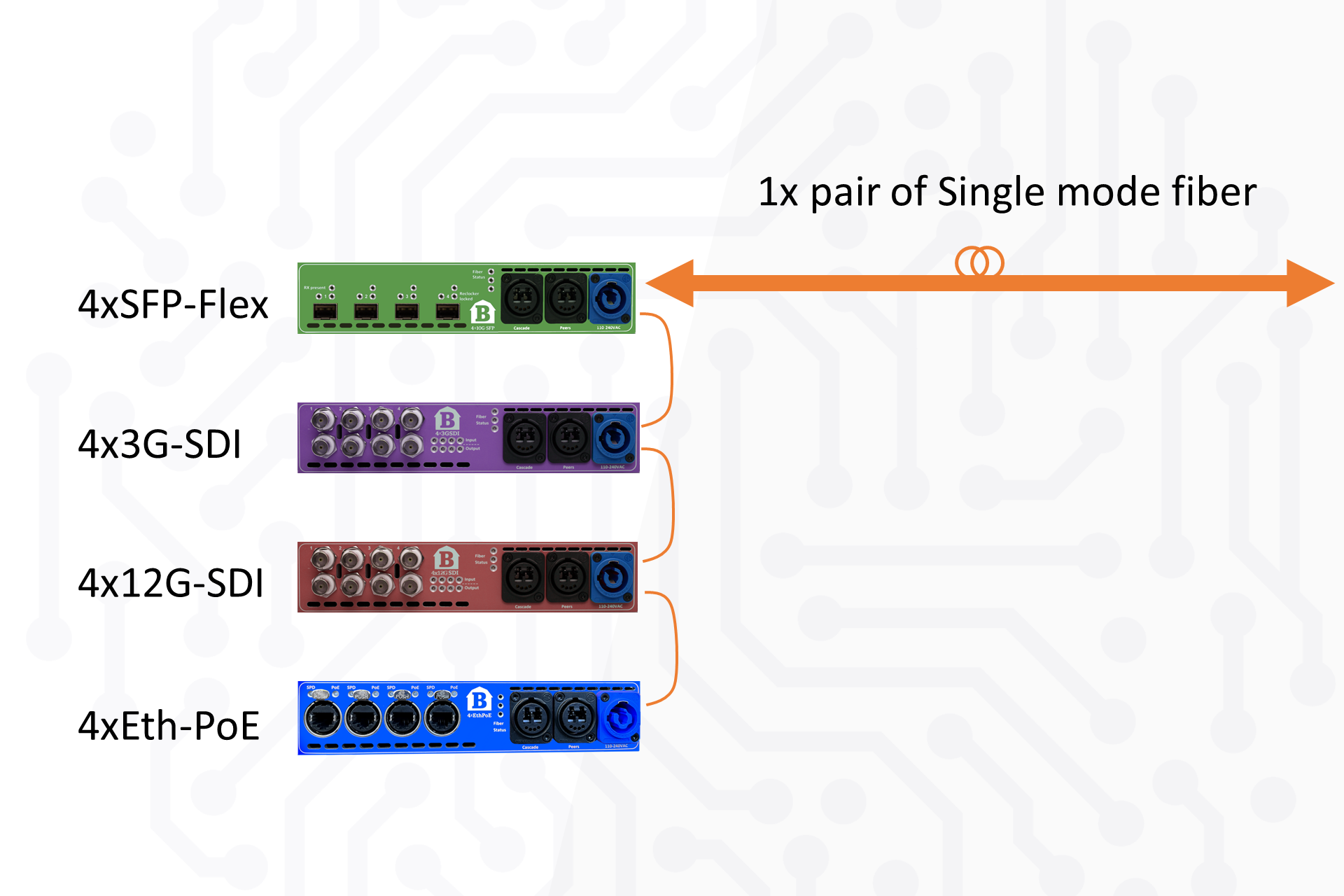 Designed to be a cost-effective and easy-to-deploy solution for transmitting multiple ethernet signals both directions on a single fiber cable up to 10km distance. BarnColor allows you to handle up to 16 separate 1Gbit/s links. Each BarnColor device handles up to 4 separate 1Gbit links and up to 4 different colors can be daisy chained. This flexible system is easy to install, upgrade and use. It is well suited for both fixed and temporary installations. Can be combined with any models in different colors.